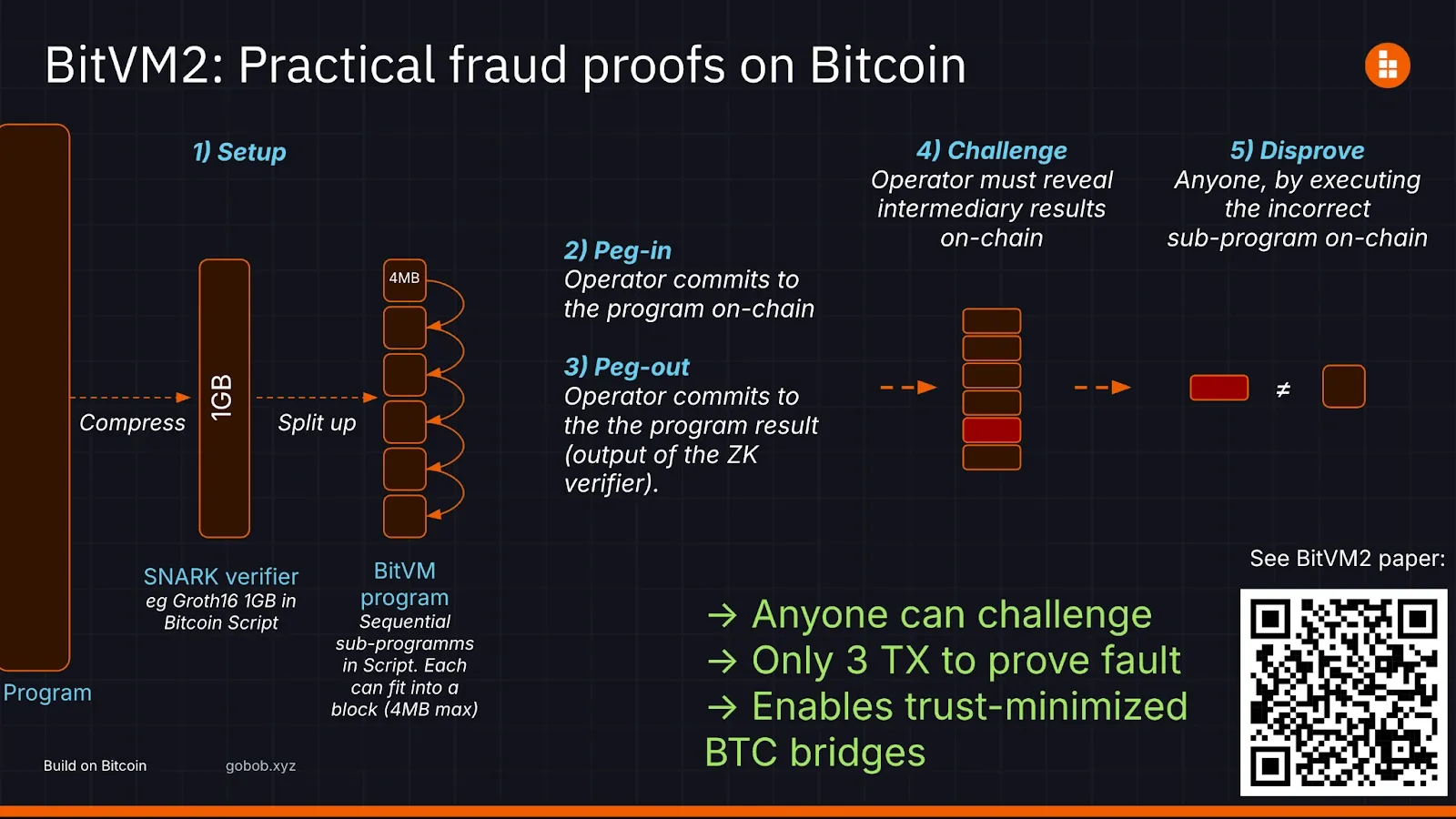 The BitVM Bridge makes use of BitVM2 to implement a light-client bridge on Bitcoin. The L2 verifies Bitcoin, Bitcoin verifies the L2. The most interesting part is the un-wrapping, also called the peg-out, which has long been a challenge for Bitcoin DeFi protocols.