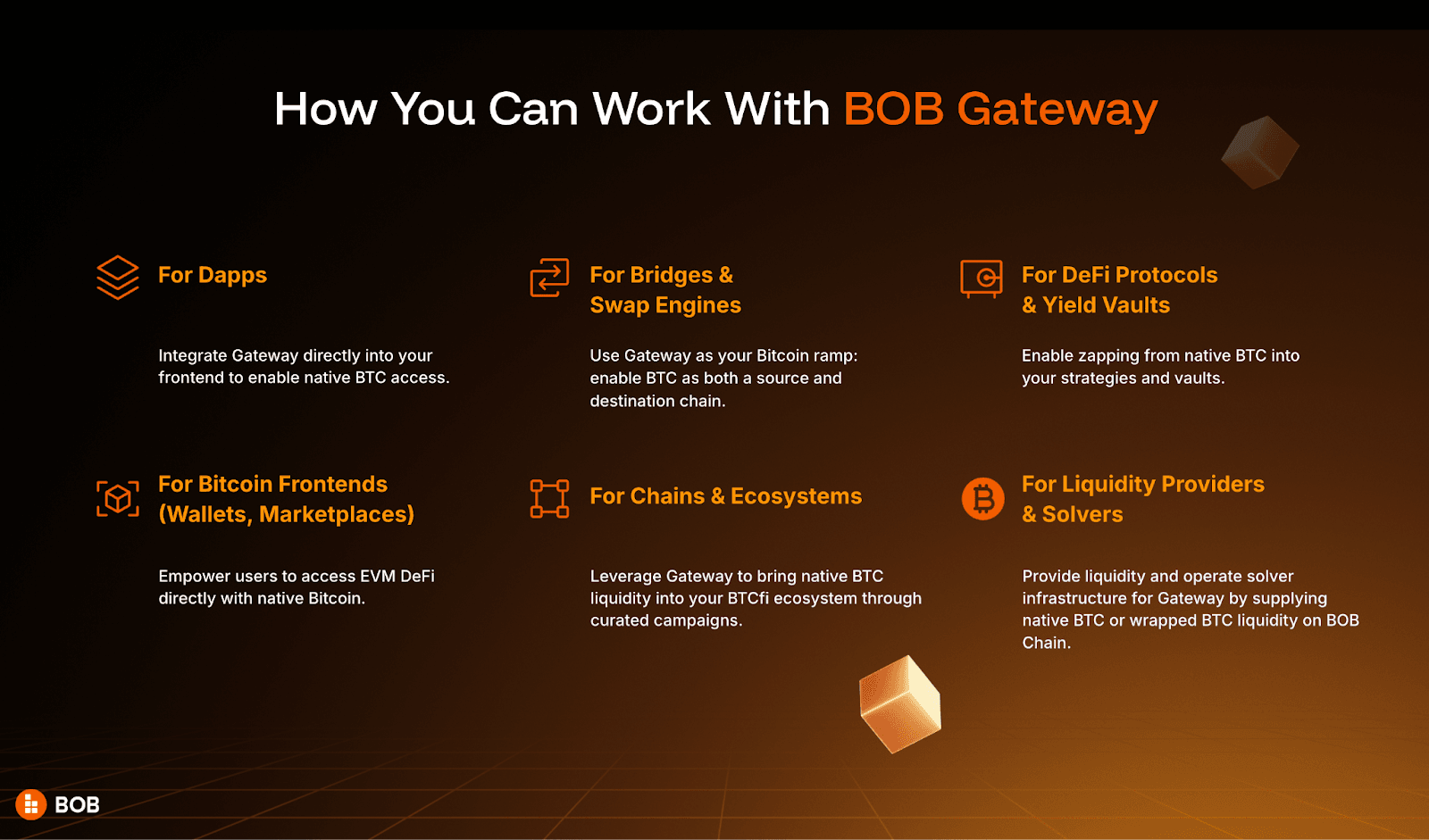 By making Bitcoin easy to integrate, BOB Gateway helps more platforms support native BTC flows. That foundation is key to turning Bitcoin from a passive store of value into the backbone of an open, onchain banking system - the Bank of Bitcoin. Read more about BOB’s Bank of Bitcoin vision here.