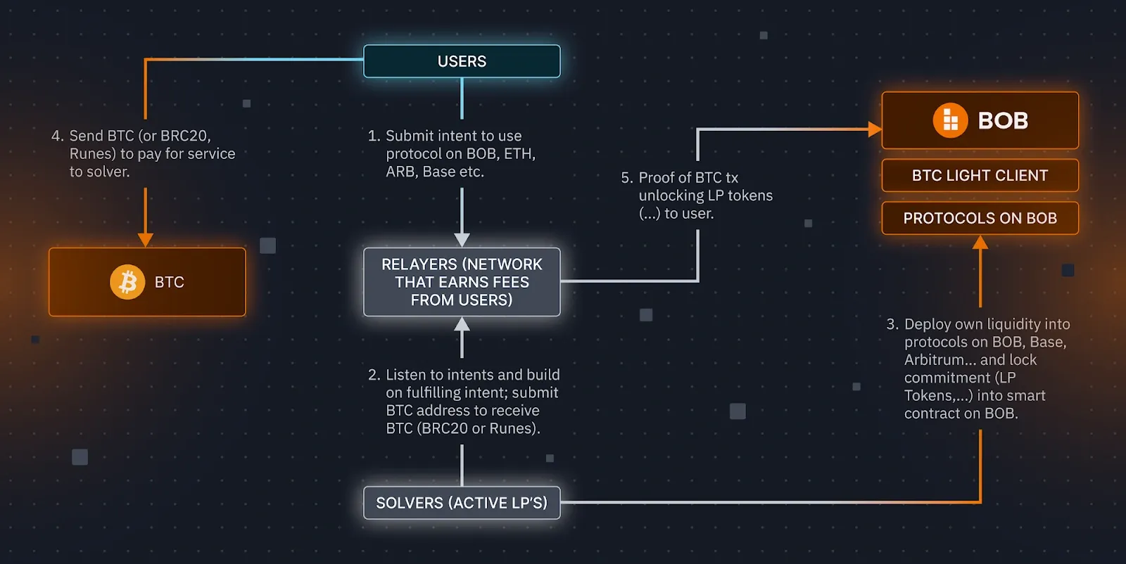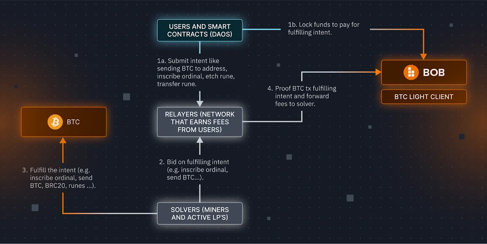 - This intent is broadcast to the network of relayers and solvers. The solvers are competing to inscribe the ordinals in return for the funds locked on BOB.