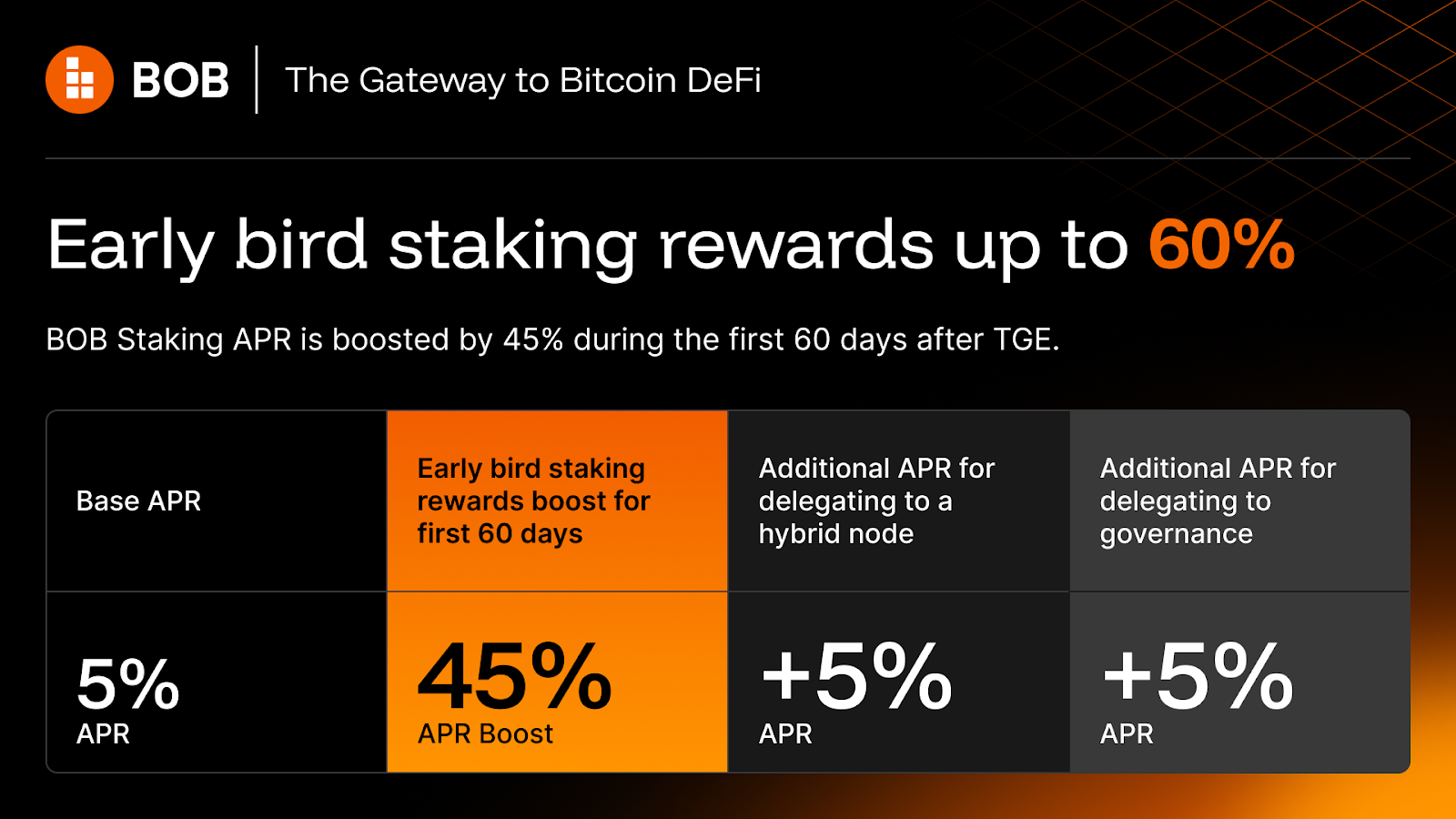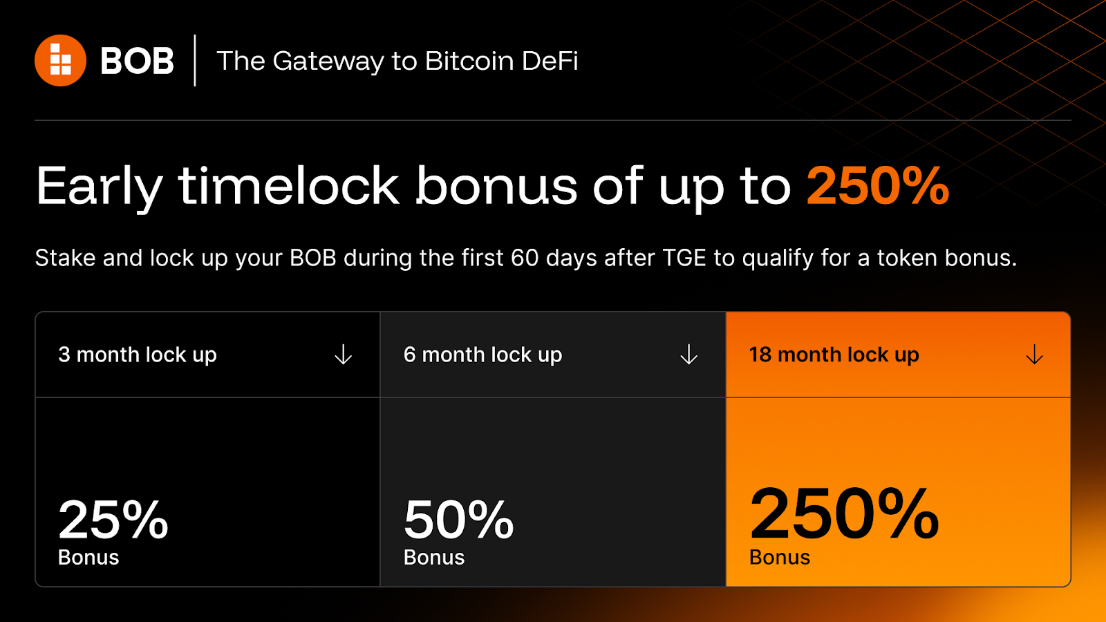 Everyone who stakes and timelocks their tokens during the first 60 days after TGE will receive a BOB token bonus as a reward for believing in the long-term potential of BOB.
