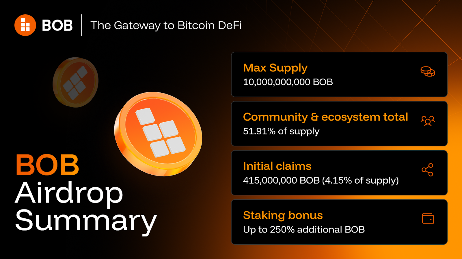 With a fixed supply of 10,000,000,000 BOB tokens, the upcoming airdrop will see 4.15% of the total supply allocated to BOB community members that have supported BOB’s journey to become the Gateway to Bitcoin DeFi. You may be eligible if you have harvested Spice in BOB Fusion by participating in BTCFi on the BOB network, completed quests or participated in wallet and content creation campaigns.