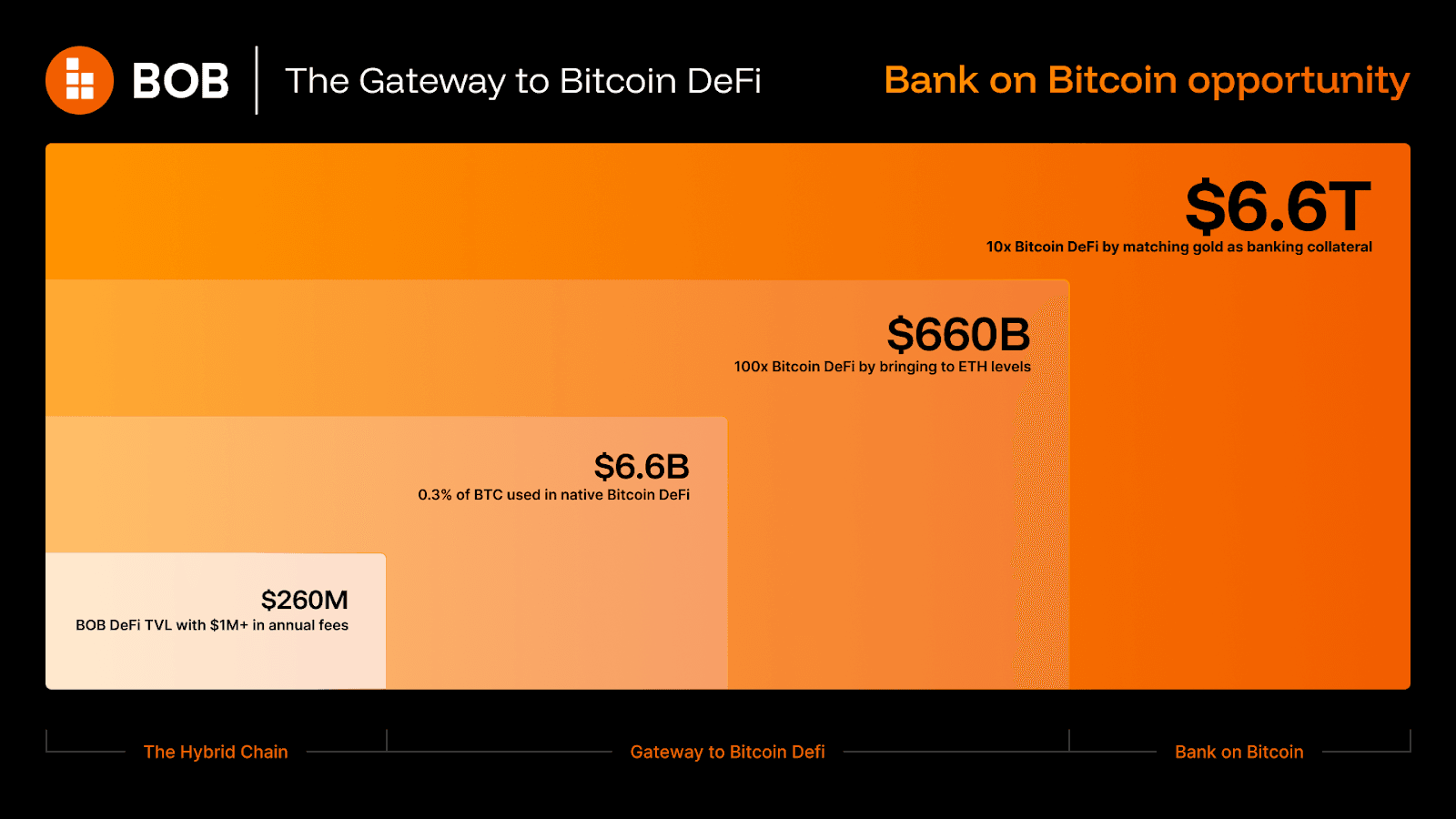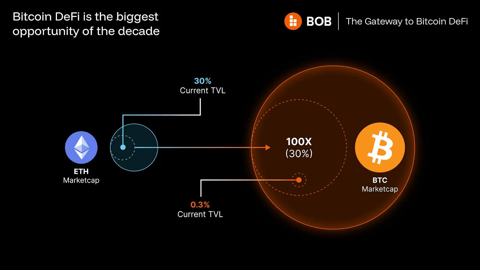 Bitcoin DeFi has massive growth potential. Currently, only 0.3% of Bitcoin's market cap is used in true BTCFi, compared to Ethereum's 30%. That’s a 100x opportunity equivalent to approximately $700B at today’s Bitcoin prices, just waiting to be unlocked - and that’s exactly what BOB is designed to do.