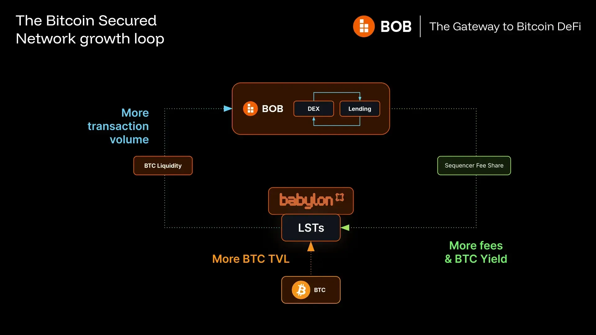 As a Bitcoin Secured Network (BSN), BOB will achieve Bitcoin finality where all transactions and assets will be secured by billions of dollars of staked BTC. The Liquid Staking Tokens (LSTs) obtained by staking on BOB Earn create a powerful flywheel effect - the more LSTs deployed in DeFi, the more transaction fees generated, which increases yields and attracts even more Bitcoin to the platform.