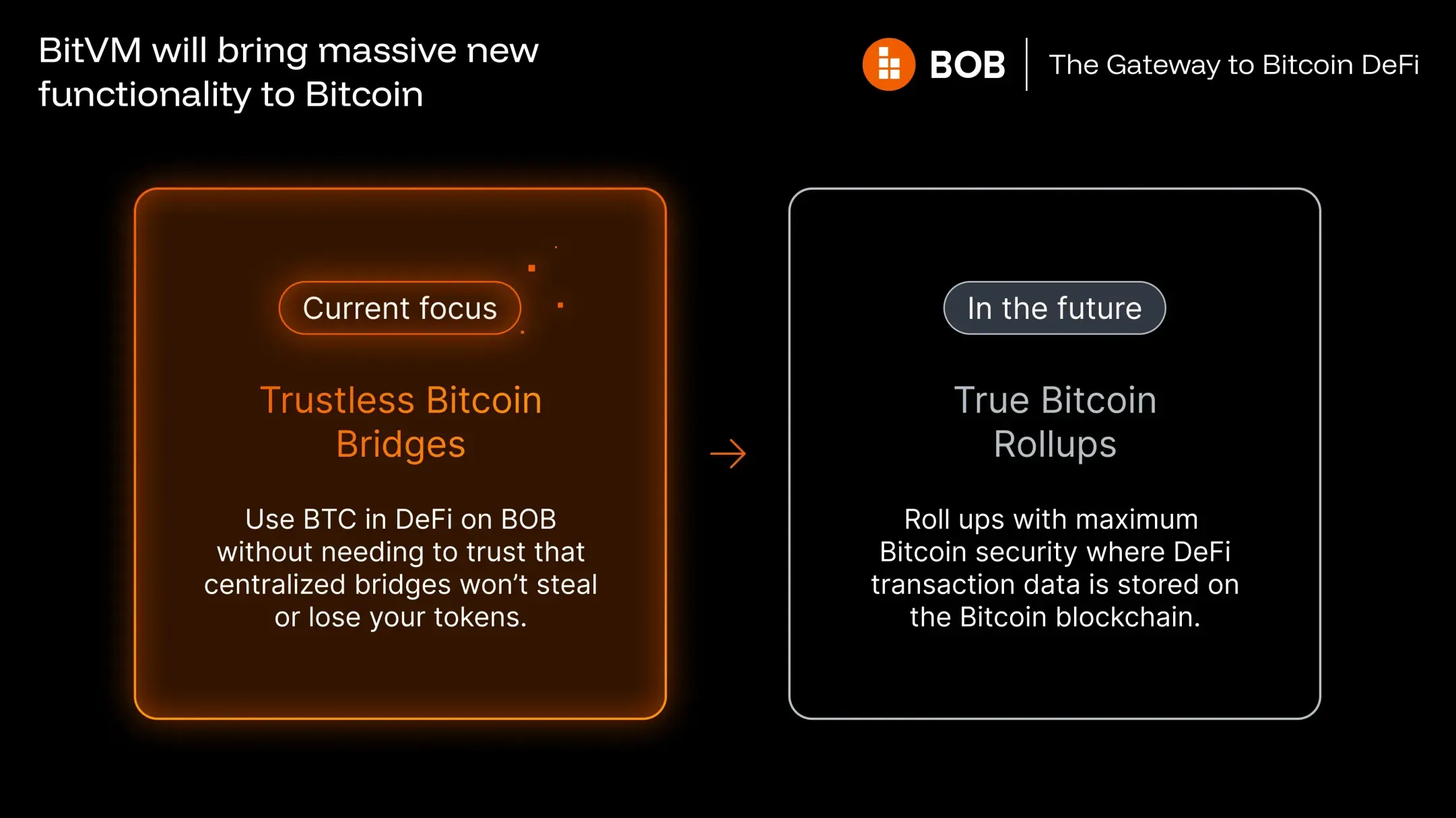BitVM is revolutionary bridging technology that will soon enable trust-minimized BTC transfers from Bitcoin directly to BOB. Unlike traditional Bitcoin bridges that rely on custodians or multisig groups, BitVM ensures your Bitcoin stays safe as long as just one participant remains honest. This means BTC on BOB is just BTC - no wrappers or middlemen, and similar to how ETH on Optimism is still ETH.