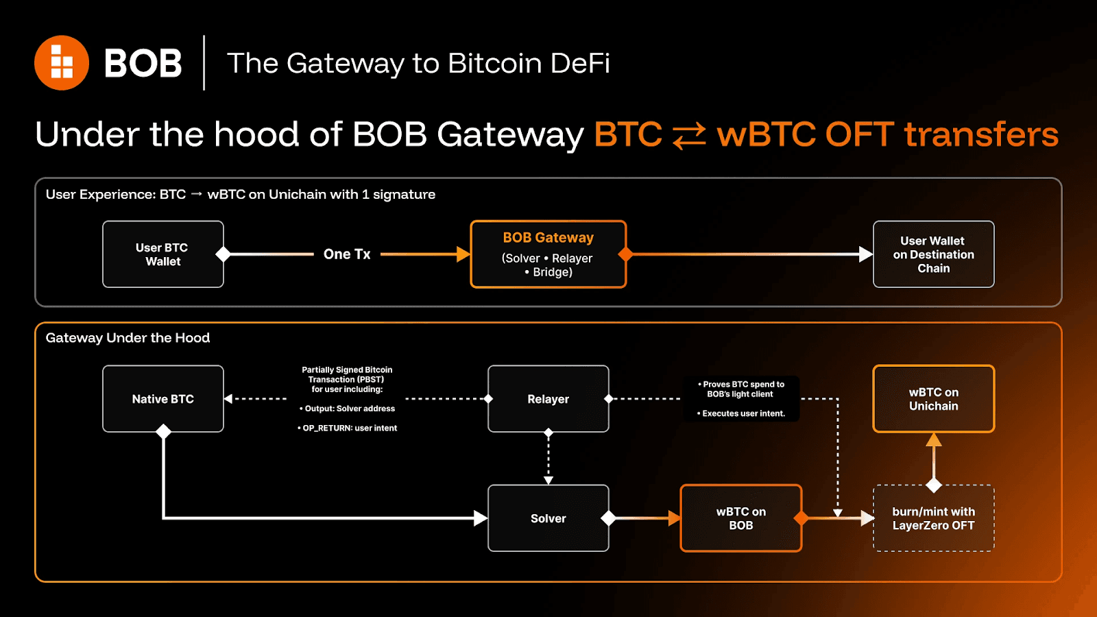 Through Bitcoin intents and LayerZero integration, BOB Gateway handles the conversion between native BTC and wrapped BTC (wBTC.OFT), while the Gateway SDK extends this capability to over 15,000 dapps. This makes BOB the universal gateway for accessing Bitcoin yield opportunities wherever they exist, not just on BOB itself.